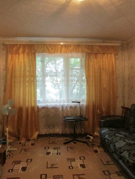 1-к молодоженка 19 кв.м., хороший ремонт, окно пластиковое, туалет в комнате, душ на этаже. Полностью меблирована (диван с креслами, стенка, кухонные шкафчики и др.), есть холодильник, телевизор и электрическая плита.