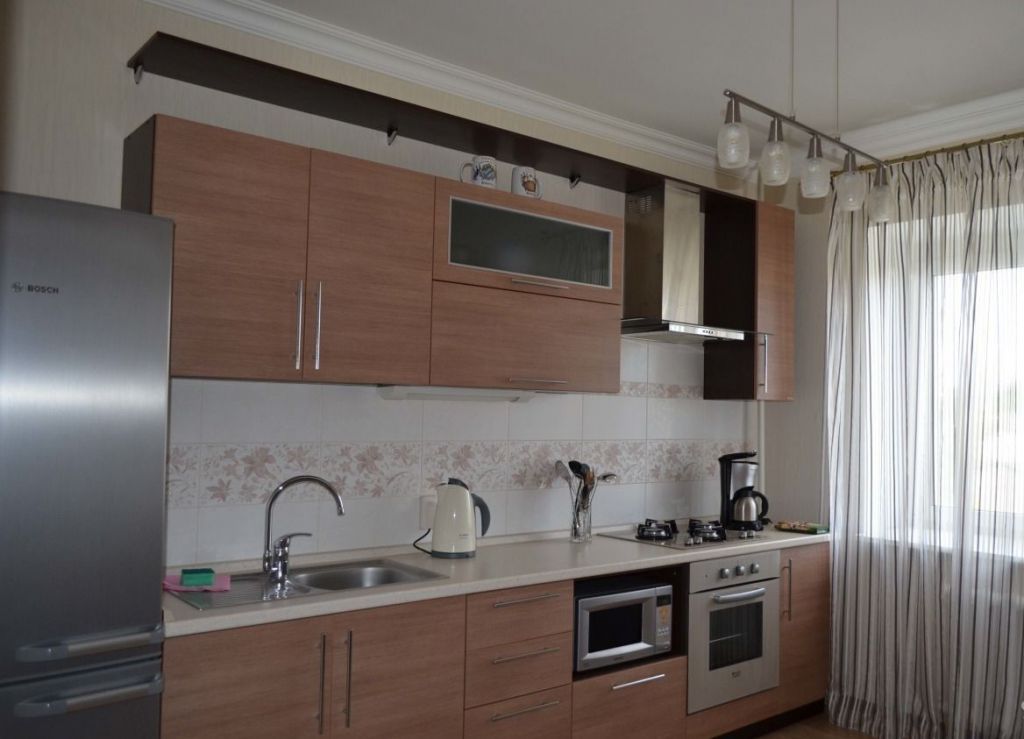 Кухня оборудована гарнитуром со встроенной бытовой техникой, обеденным столом со стульями; имеется холодильник двухкамерный, стиральная машина автомат, газовая варочная панель, духовой шкаф, вытяжка, электрочайник, микроволновая печь, наборы посуды.